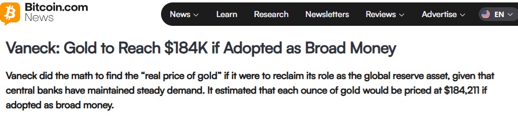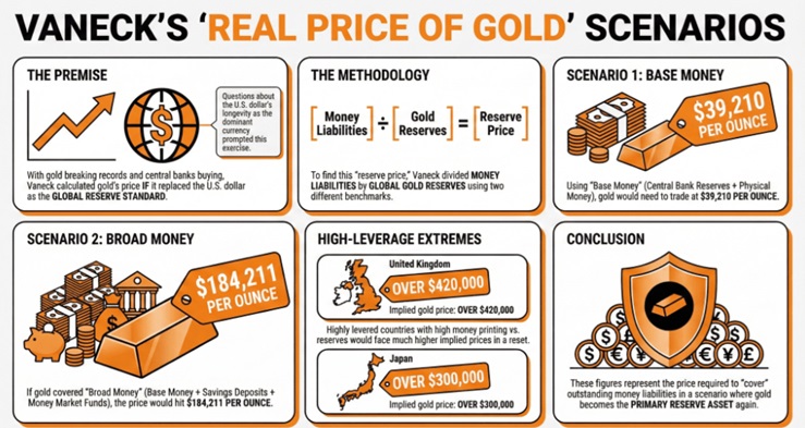 VanEck 解釋稱:「這些數字代表了一種情境下黃金重新成爲主要儲備資產時所需的價格,以‘覆蓋’懸而未決的貨幣負債。」