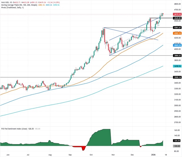 Valencia表示,若要延續上漲勢頭,金價需要突破週三創下的4643美元/盎司的歷史高點,以確認看漲傾向,併爲金價挑戰4650美元/盎司和4700美元/盎司打開道路。反之,若金價跌破1月13日的日內低點4569美元/盎司,則可能下探至4550美元/盎司,甚至4500美元/盎司。