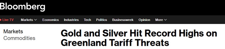 24K99訊 週一(1月19日)亞洲交易市場開盤後,黃金價格大幅跳空高開,隨後進一步暴漲並創下紀錄高點,此前美國總統特朗普(Donald Trump)表示,將對反對他拿下格陵蘭島計劃的八個歐洲國家加徵關稅。白銀價格也暴漲創下歷史新高。