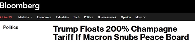 美國彭博社週二最新報道稱,美國總統特朗普(Donald Trump)抨擊法國領導人馬克龍(Emmanuel Macron )拒絕了他加入擬議「和平委員會」(Board of Peace)的邀請,並暗示他可能對香檳徵收200%的關稅。