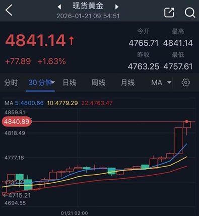 金價目前最高觸及4841.14美元/盎司,創下歷史新高,金價日內暴漲近78美元。