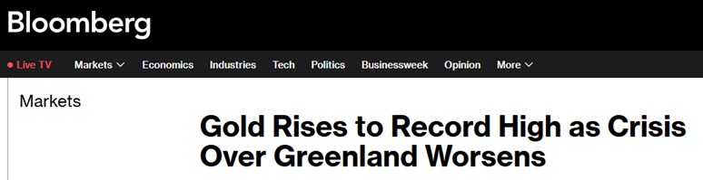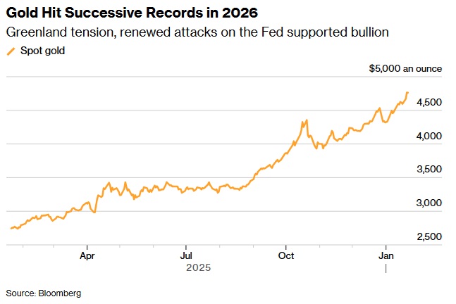 美國彭博社稱,由於格陵蘭島危機加劇以及日本政府債券市場崩盤,避險需求上升,黃金價格飆升至歷史新高,白銀價格也接近歷史最高點。