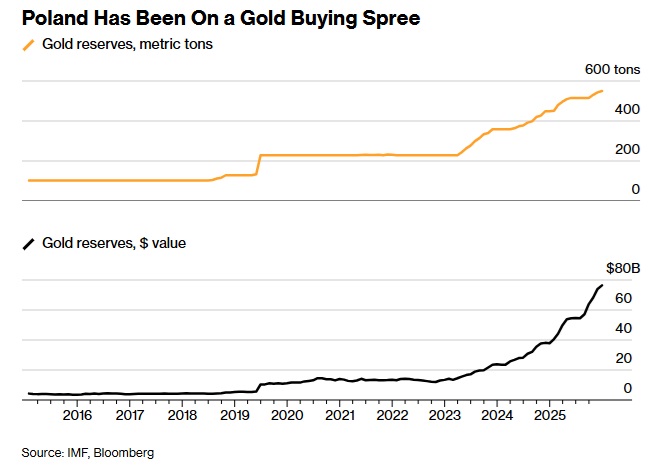 波蘭央行行長亞當·格拉平斯基(Adam Glapiński)一直在推動提高黃金儲備上限的努力,黃金儲備在2025年底已達到550噸。直到現在,波蘭央行最多可以將其總儲備的30%分配給黃金,而飆升的黃金價格使黃金在儲備中佔比約28%。