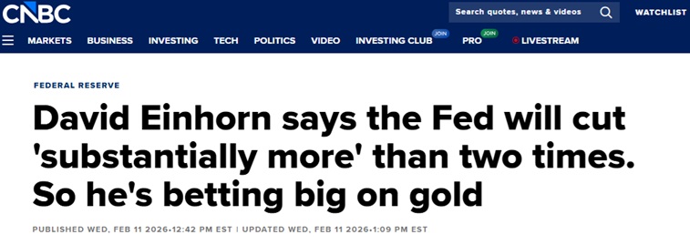 24K99訊 美國消費者新聞與商業頻道(CNBC)週三(2月11日)報道稱,華爾街對衝基金大佬、綠光資本(Greenlight Capital)創始人兼總裁戴維·艾因霍恩(David Einhorn)預計,美聯儲今年的降息次數將超過市場目前的預期,這也讓他對自己的黃金押注更有信心。