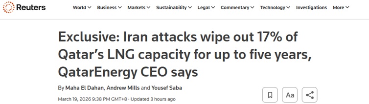 #伊朗危機追蹤#FX168財經報社(亞太)訊 英國路透社週五(3月20日)發佈獨家報道稱,卡塔爾能源公司首席執行官兼能源事務國務部長薩阿德·卡比(Saad al-Kaabi)週四告訴路透社,伊朗的攻擊已導致卡塔爾約17%的液化天然氣(LNG)出口產能中斷,每年估計造成200億美元的收入損失,並威脅到對歐洲和亞洲的供應。