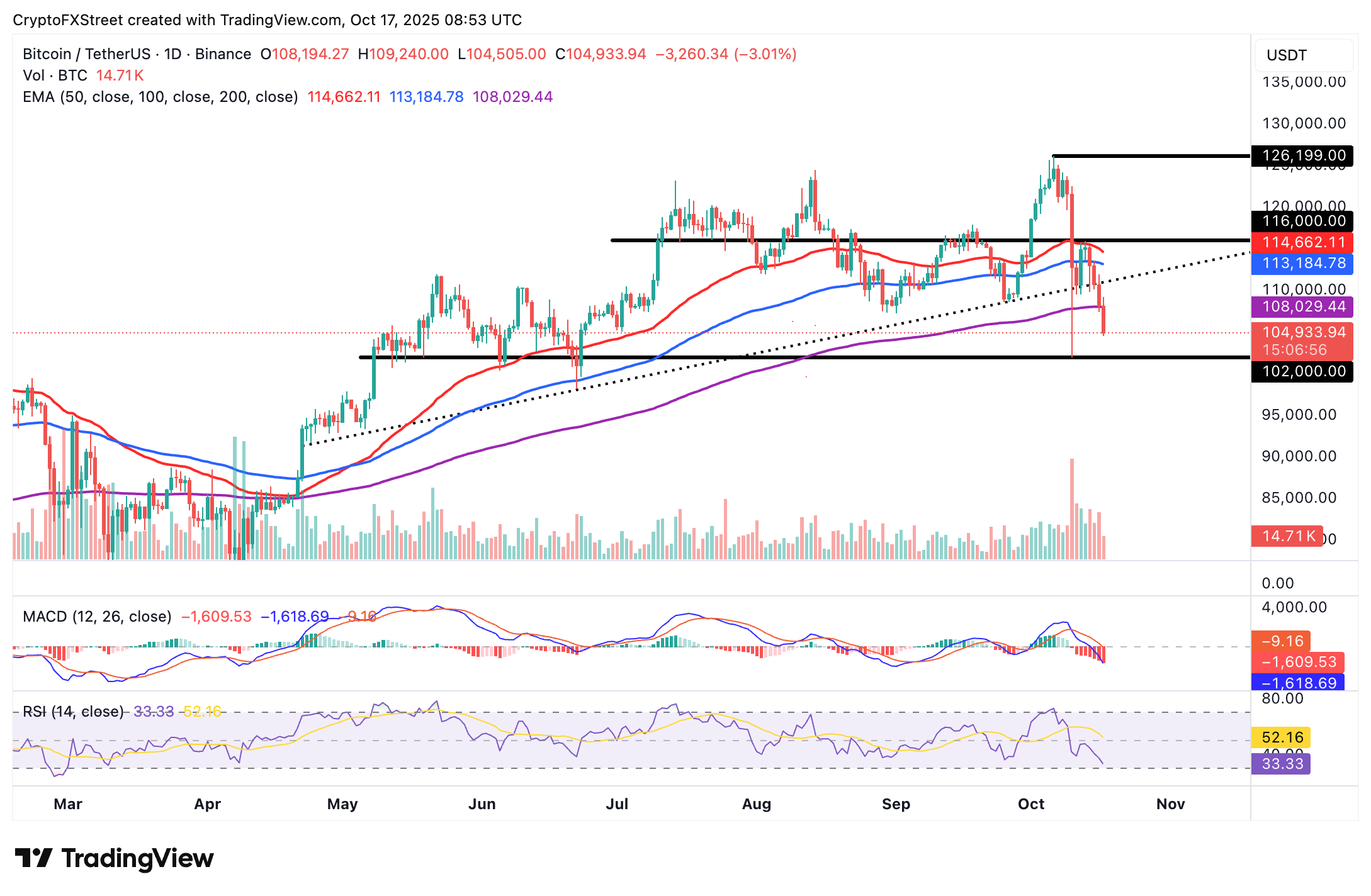 截至撰寫時,比特幣交易價格約為105,000美元,空頭加強了控制。比特幣在失去200日指數移動平均線(EMA)後,跌幅加速,目前該EMA位於108,029美元。