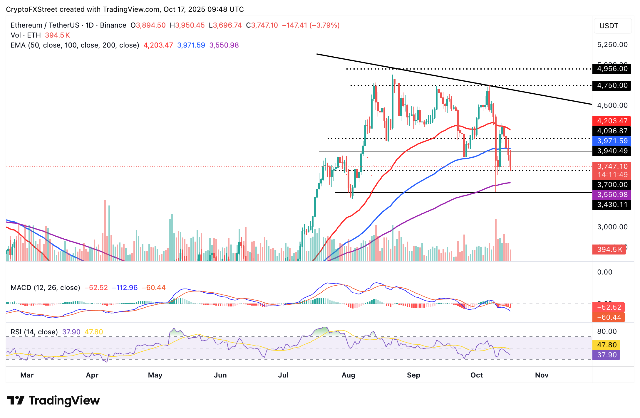 交易者將關注100日EMA在3,971美元以上的潛在反彈,以確認ETH在4,000美元水平以上的恢復。