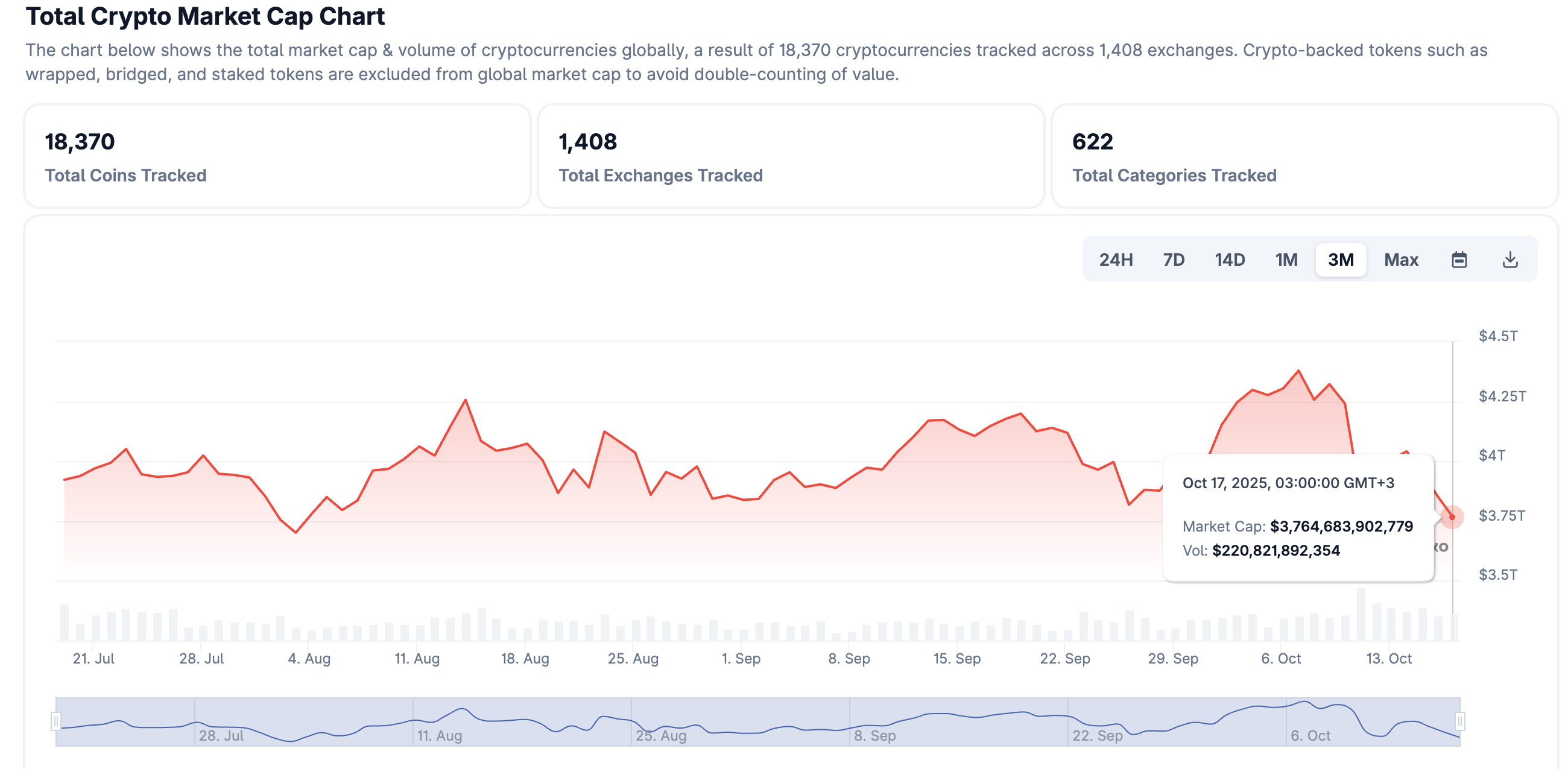 山寨幣承受了最大的壓力,以太坊(ETH)跌至3,700美元,瑞波幣(XRP)滑落至關鍵支撐位2.22美元以下。根據CoinGecko的數據,過去24小時內總市值下降了6%,降至3.76萬億美元,此前在10月7日達到4.38萬億美元的峰值。