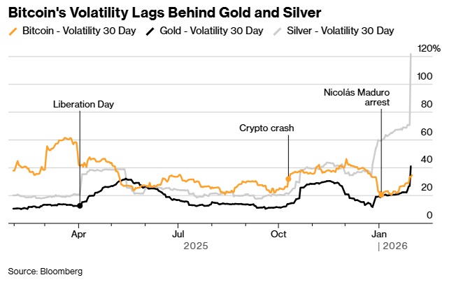 比特幣未能對地緣政治壓力、美元走弱或風險資產反彈作出迴應。即便近期黃金和白銀出現劇烈波動,加密市場也未見資金輪動。