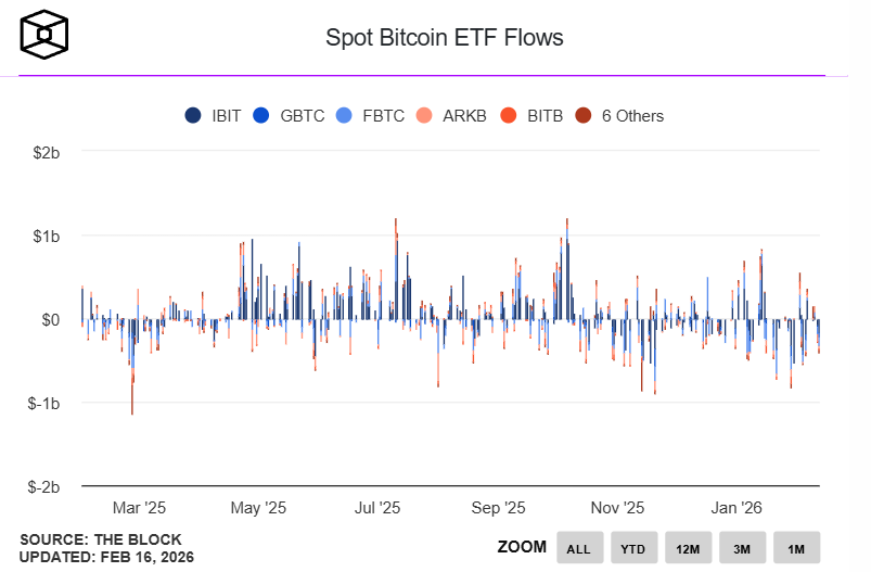 BRN研究主管Timothy Misir表示,在機構資金流持續爲負、市場結構缺乏明確共識的情況下,加密市場仍承受壓力。Misir在週一的報告中寫道:「截至2月中旬,加密市場持續承壓:ETF持續淨流出、價格回落至7萬美元下方,市場結構依然脆弱。」