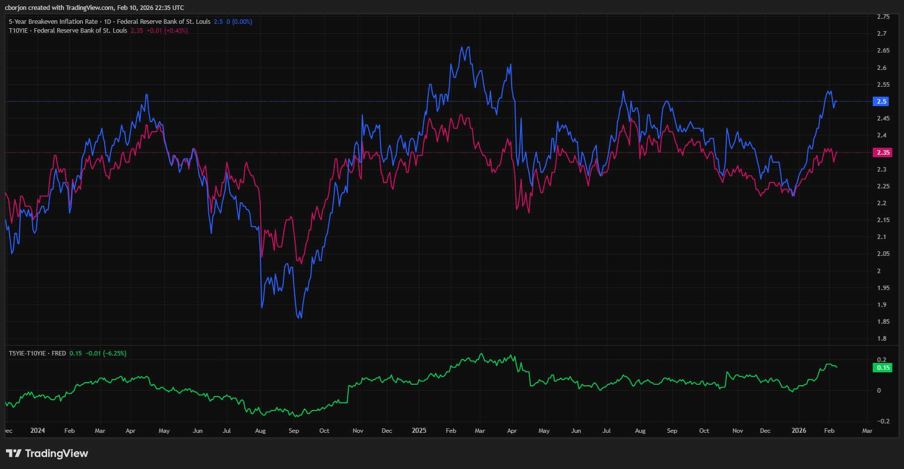 與此同時,金融市場對五年期的通脹預期為2.5%,根據五年期盈虧平衡通脹率。十年期的盈虧平衡上升至2.35%,表明市場預計通脹將維持在該平均水平附近。