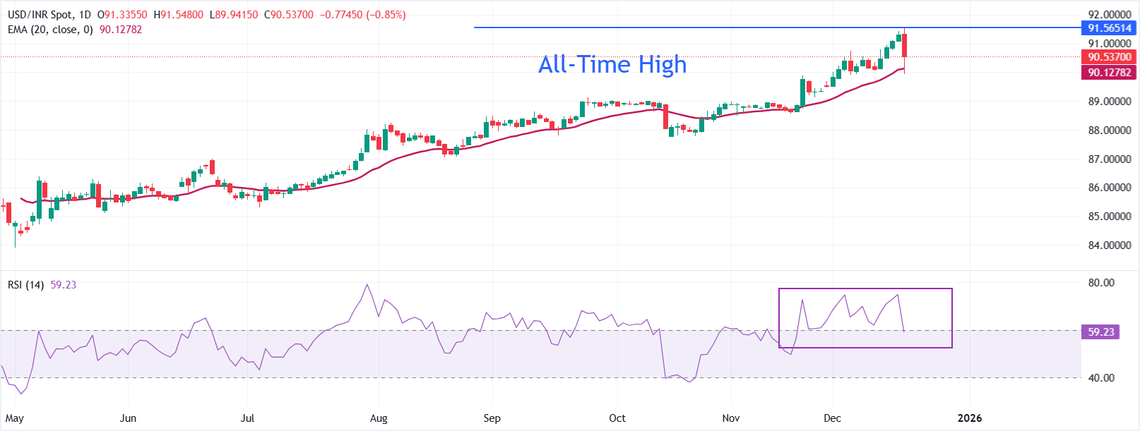 趨勢條件依然穩固,儘管動能有所減弱,RSI從70回落至59.23。只要美元/印度盧比捍衛移動平均線基礎,回調將保持在控制之中,支撐區間在89.9556–89.8364的20日EMA集群。如果日收盤低於該區域,將使偏向轉向盤整,而維持在其上方的買盤將留有進一步上行的空間。
