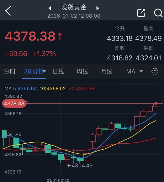 24K99訊 週五(1月2日)亞市盤中,現貨黃金持續大幅攀升,目前金價位於4378美元/盎司附近,日內暴漲近60美元。FXStreet分析師Lallalit Srijandorn週五撰文,對金價進行分析。