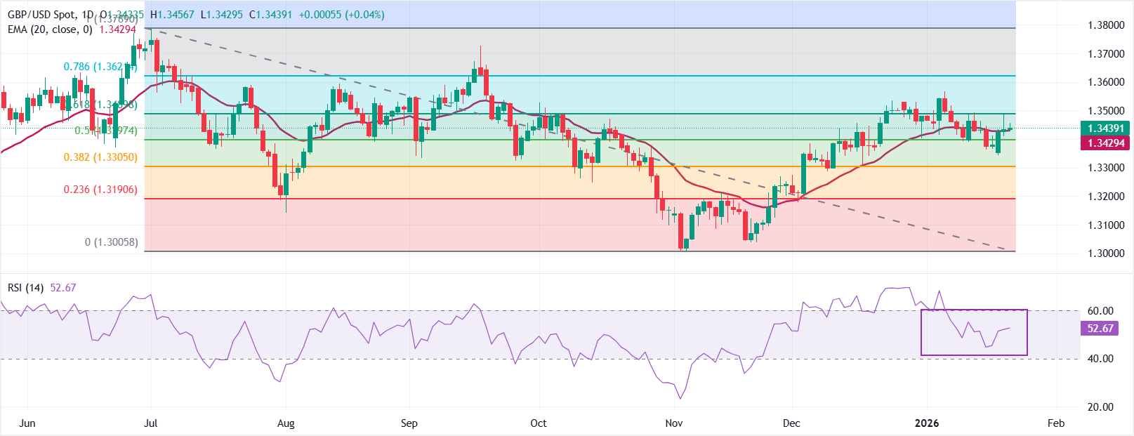 截至發稿時,英鎊/美元在1.3440附近大致橫盤交易。價格略高於20日指數移動平均線(EMA)1.3429,EMA在穩步上升後趨於平坦,顯示出盤整信號。若持續收於20日EMA之上,將使短期偏向上行。