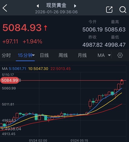 現貨黃金價格剛剛最高觸及5085.63美元/盎司,刷新歷史高位,金價日內暴漲97美元。