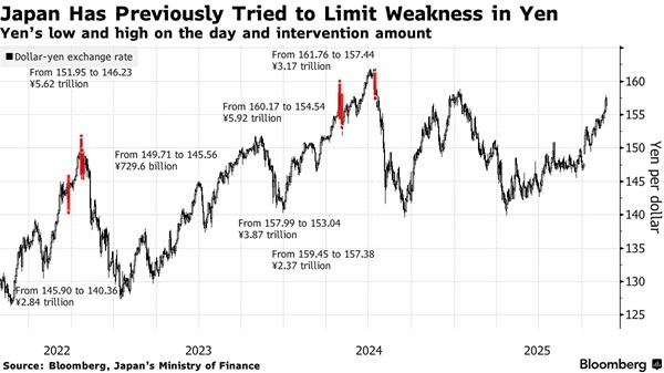 日本政府在2024年斥資接近1000億美元買入日元以支撐匯率。在四次出手時,日元兌美元匯率都在約160附近,這也使得160這一水平大致成爲市場判斷未來可能再次採取行動的參考線。