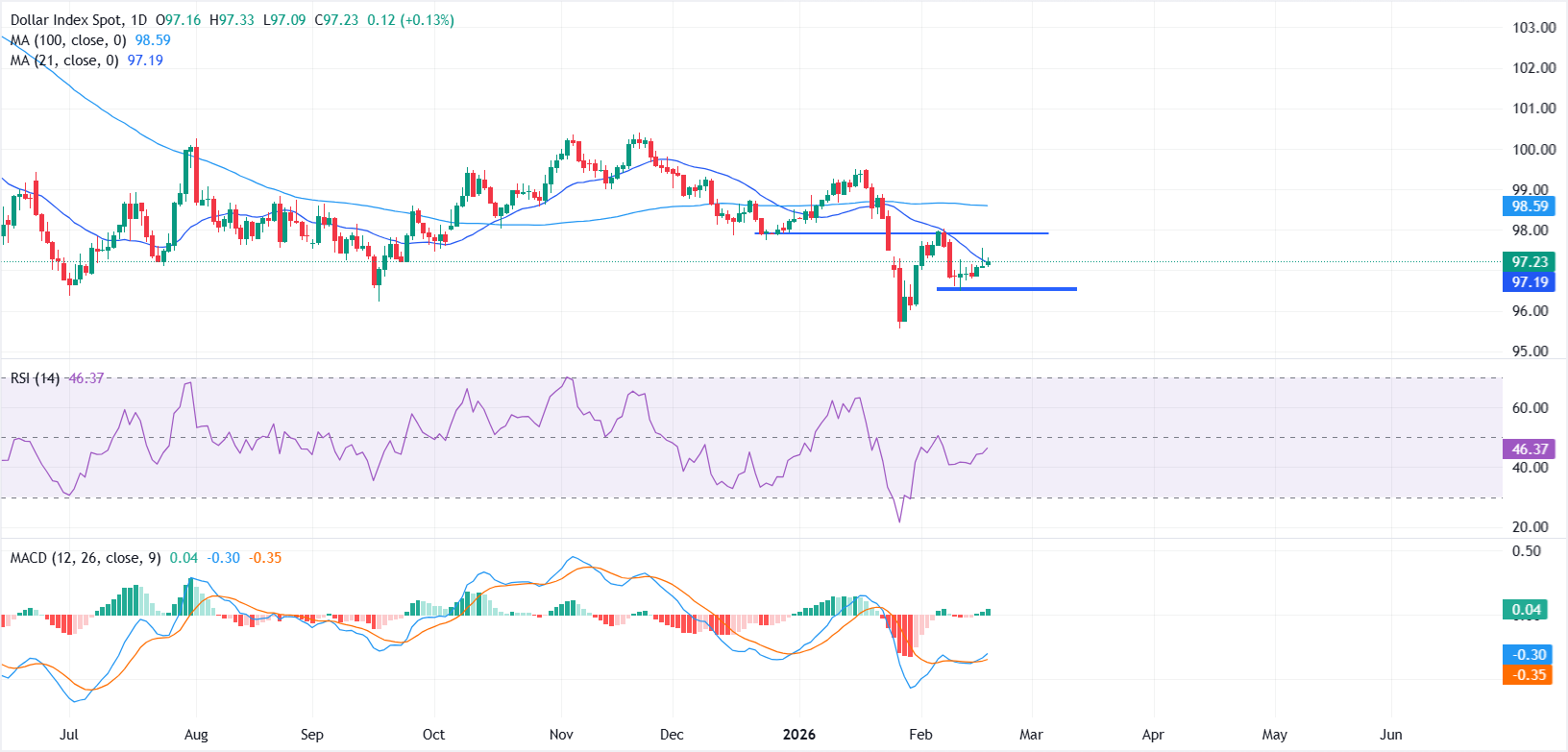 美元指數(DXY)追蹤美元相對於六種主要貨幣的價值,週三保持穩定,交易員在關鍵的美國經濟數據發布前進行佈局。截至發稿時,指數交易在97.21附近,日內上漲約0.10%。