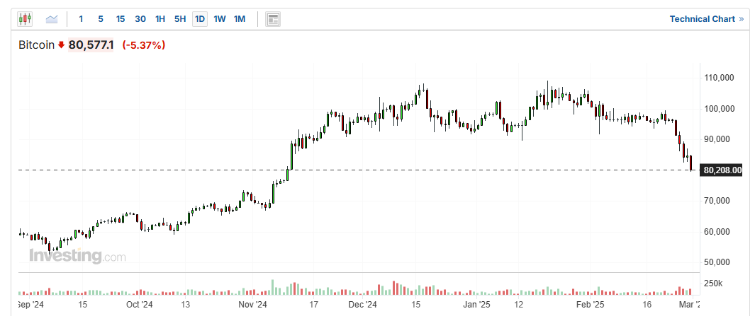 比特幣價格跌5.37%,報80577.1美元,稍早一度跌至79535.1美元,失守8萬美元關口,創下去年11月以來新低。