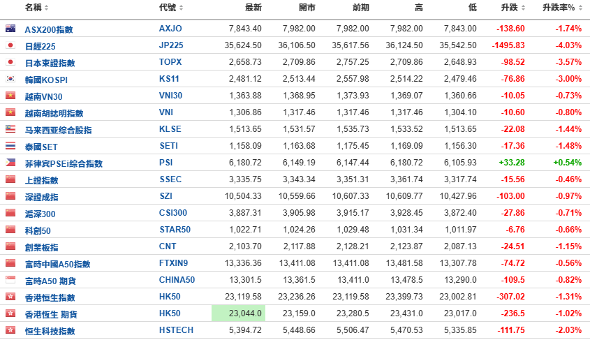 除了美股期貨,全球股市同時下跌,其中日本股市重挫4%,韓國股市跌3%,滬深300指數跌0.7%,香港恒生指數跌逾1.3%,恒生科技指數收跌2%。