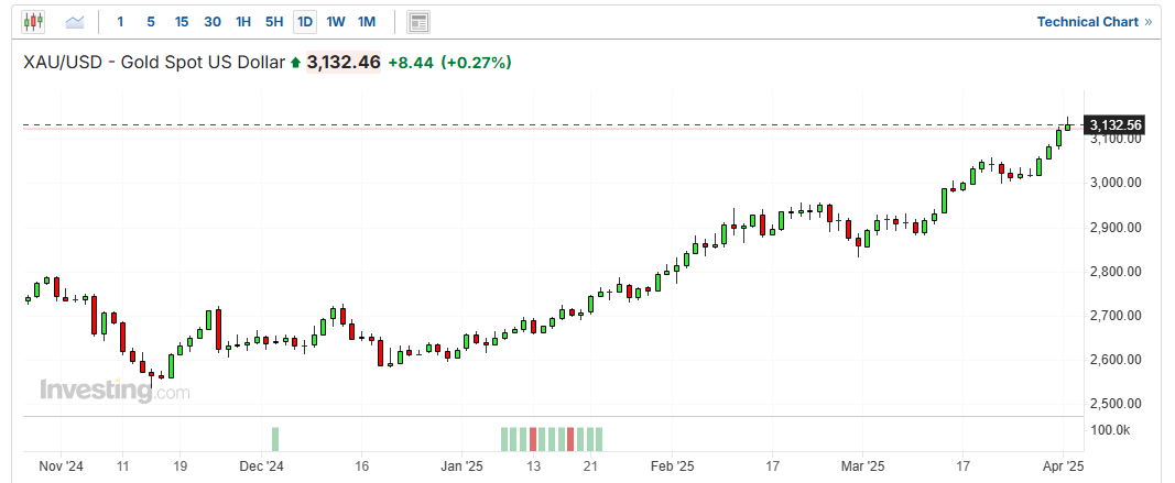 圍繞貿易政策的不確定性促使投資者轉投黃金,這一傳統地緣政治和經濟動盪時期的避險資產。金價已連續四個交易日刷新紀錄。