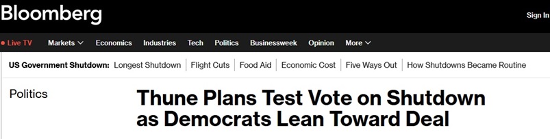 美國彭博社報道稱,參議院共和黨領袖約翰·圖恩(John Thune)表示,一項協議「正在逐步達成」,他計劃在週日就一項旨在結束長達40天的政府停擺的支出方案進行試探性投票。