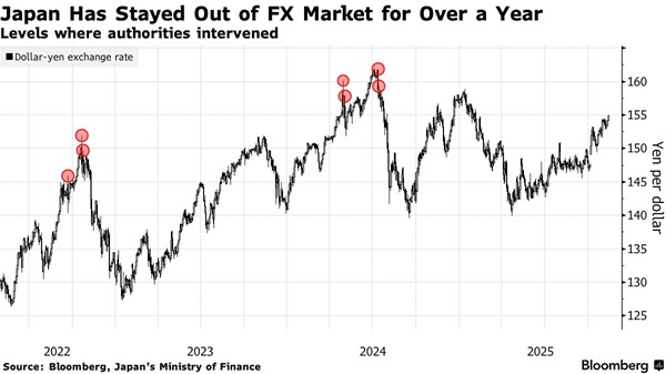 去年日元兌美元匯率跌至160.17附近時,日本財務省出手干預,並在157.99、161.76和159.45附近進行了額外干預。官員們表示,他們更關注匯率的波動性和走勢速度,而非具體的匯率水平。