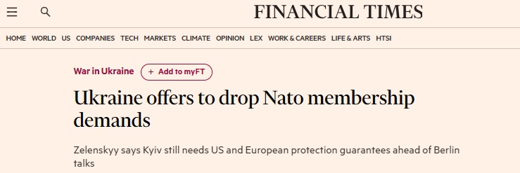 FX168財經報社(亞太)訊 英國《金融時報》週日(12月14日)報道稱,烏克蘭總統澤連斯基(Volodymyr Zelenskyy)表示,他願意放棄對加入北約的要求,換取來自美國和歐洲的安全保障,此舉旨在推動於週日在柏林舉行的和平談判取得進展。
