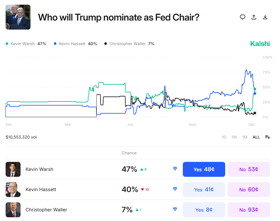 截至撰稿,哈塞特在Kalshi上的勝出概率約爲 40%,較本月初一度超過 80% 的高點明顯回落;沃什的概率則升至 47%,躍居榜首,並較12月初約 11% 大幅攀升。