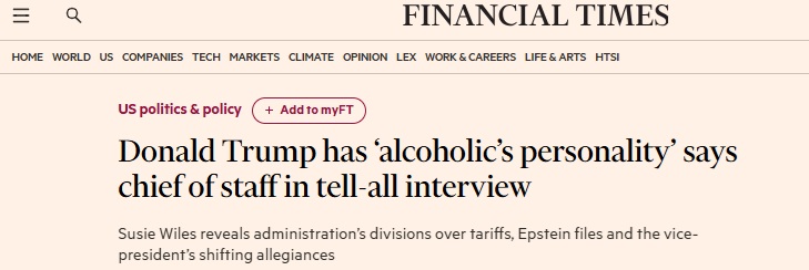 英國《金融時報》稱,美國總統特朗普有着「酒鬼式的性格」;副總統萬斯(JD Vance)「十年來一直是陰謀論者」;埃隆·馬斯克(Elon Musk)則是「怪人」。而圍繞華盛頓所謂的「解放日」關稅,內部的分歧「非常巨大」——這一關稅在4月擾動市場,隨後不得不被撤回。