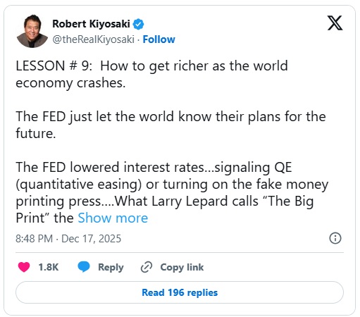 12月17日,在美聯儲最新一次降息後,這位暢銷個人理財書《富爸爸窮爸爸》(Rich Dad Poor Dad)的作者在社交平臺X發文。