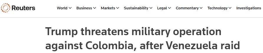 路透社稱,特朗普在空軍一號上對記者的表態,使外界看到了美國可能進一步在拉丁美洲進行軍事幹預的可能性,並暗示如果哥倫比亞和墨西哥不減少向美國輸送非法毒品的流量,也可能面臨軍事行動。