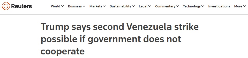 特朗普週日還表示,在抓獲馬杜羅之後,如果馬杜羅政府其餘成員不配合他「修復」該國的努力,美國可能會對委內瑞拉發動第二次軍事打擊。