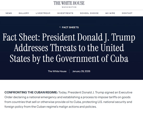 據白宮發佈的情況說明書,美國總統特朗普簽署了一項行政命令,「宣佈國家緊急狀態,並建立一套程序,對向古巴出售或以其他方式提供石油的國家的商品徵收關稅」,「以保護美國國家安全和外交政策免受古巴政權惡意行爲與政策的侵害」。