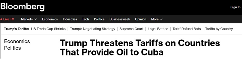 該命令要求美國商務部識別可能向古巴提供石油的國家,並稱隨後由政府高層官員決定應加徵何種額外關稅。