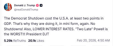 FX168財經報社(北美)訊 美國總統唐納德·特朗普週五(2月20日)再次打破常規,在官方數據發佈前40分鐘通過社交媒體提前「劇透」了令人沮喪的四季度經濟成績單。數據顯示,受去年秋季創紀錄的43天政府停擺拖累,美國第四季度GDP年化增速驟降至1.4%,遠不及市場預期的3%。特朗普在炮轟民主黨「綁架經濟」的同時,再次將矛頭指向美聯儲主席鮑威爾,稱其降息行動「醒得太晚」。隨着美聯儲即將迎來沃什(Kevin Warsh)時代,白宮與貨幣當局的權力博弈正將美國經濟推向2026年的關鍵十字路口。