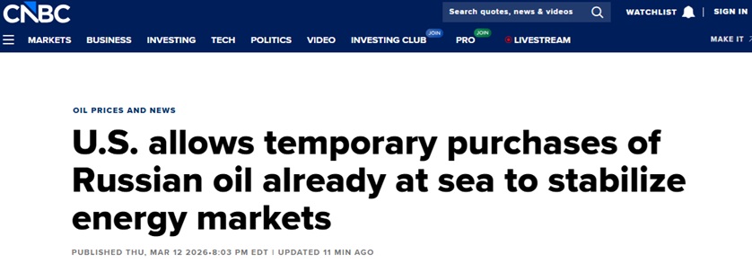 FX168財經報社(亞太)訊 美國消費者新聞與商業頻道(CNBC)當地時間週四(3月12日)晚間最新報道稱,美國週四暫時授權購買滯留在海上的俄羅斯石油,以穩定能源市場。