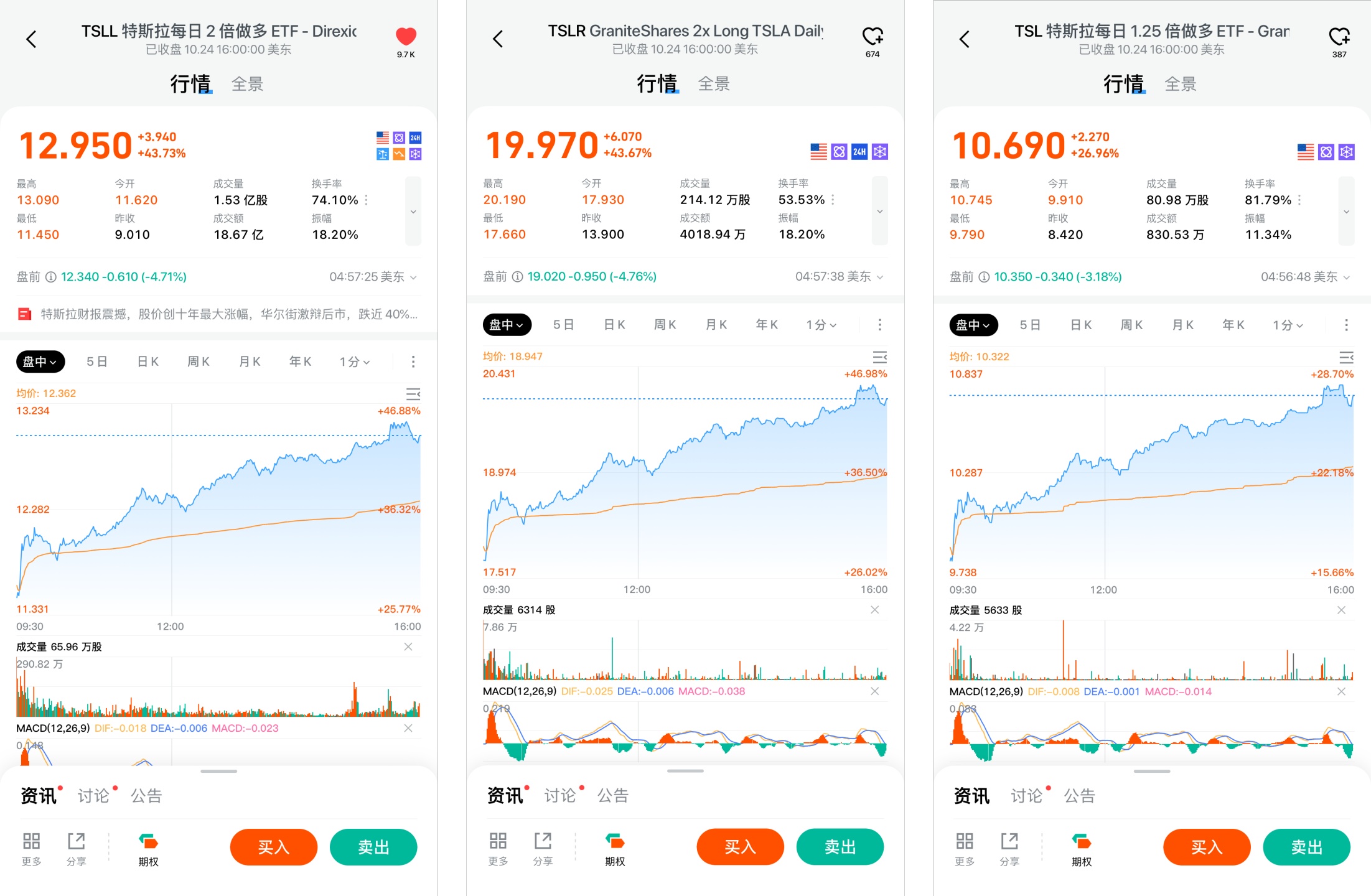$特斯拉每日 2 倍做多 ETF - Direxion(TSLL.US) 、$GraniteShares 2x Long TSLA Daily ETF(TSLR.US) 兩隻兩倍做多產品飆升 44%,$特斯拉每日 1(TSL.US) 1.25 倍做多槓桿 ETF 大漲 27%: