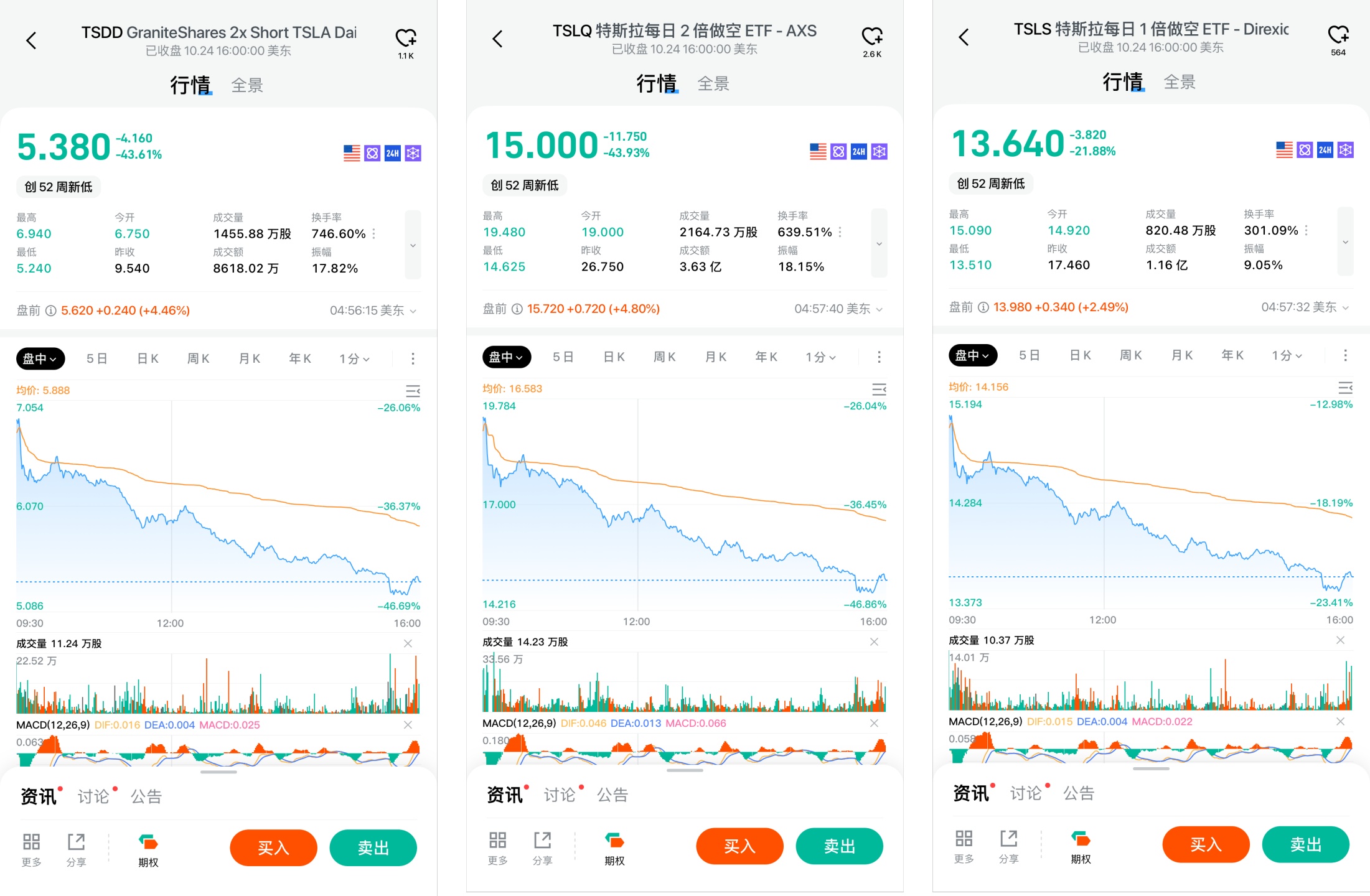 相反,$GraniteShares 2x Short TSLA Daily ETF(TSDD.US) 、$特斯拉每日 2 倍做空 ETF - AXS(TSLQ.US) 兩隻兩倍做空產品暴跌 44%,TSLS 1 倍做空 ETF 大跌 22%: