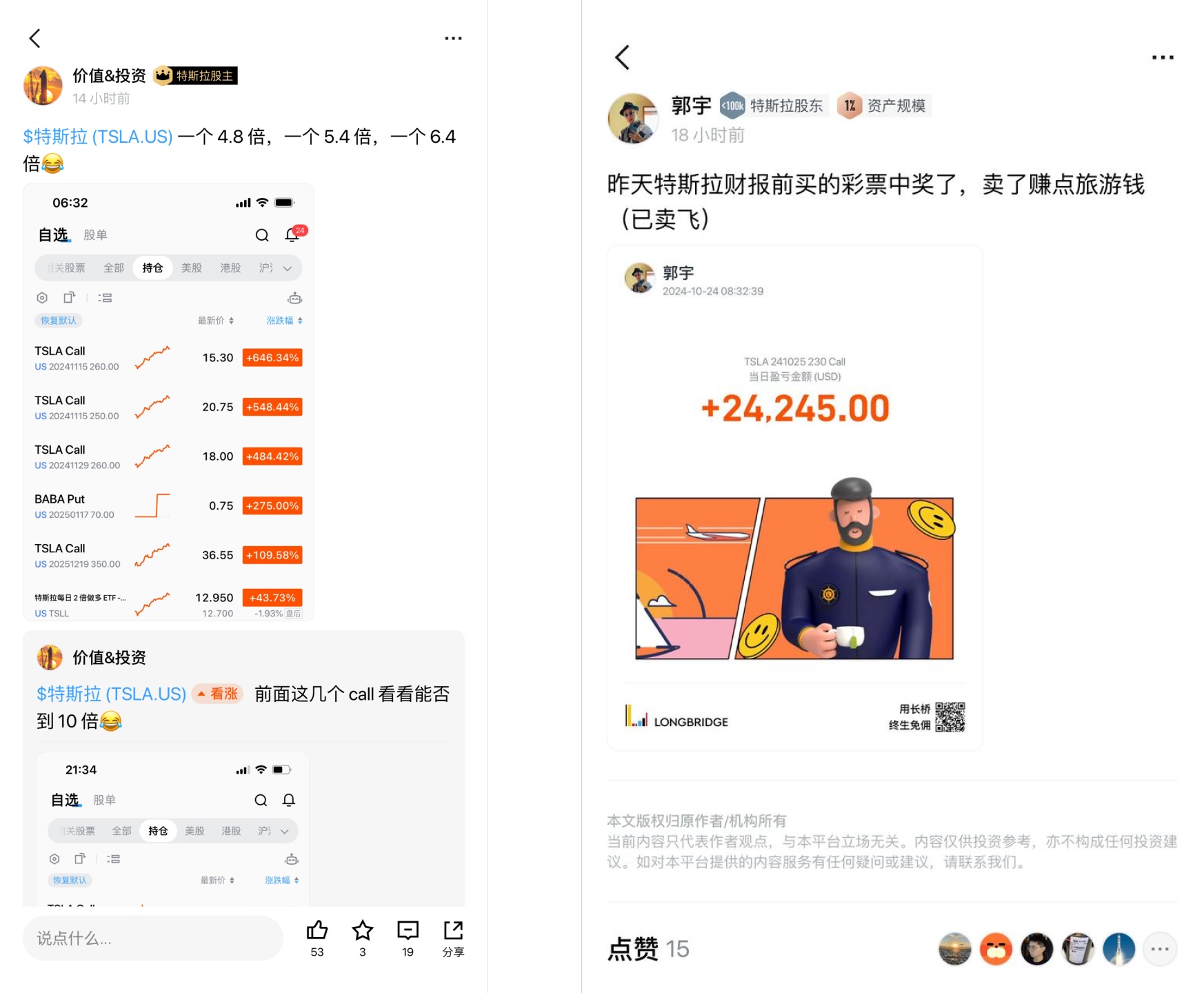@價值&投資 價值哥多隻持倉期權大漲,@郭宇 郭宇老師交易今晚到期看漲期權賺足旅遊錢: