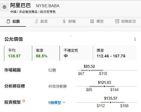 估值模型當前看漲阿里巴巴美股58%。無憂查詢港美股估值數據,點擊探索InvestingPro,新年5折優惠等你來領!