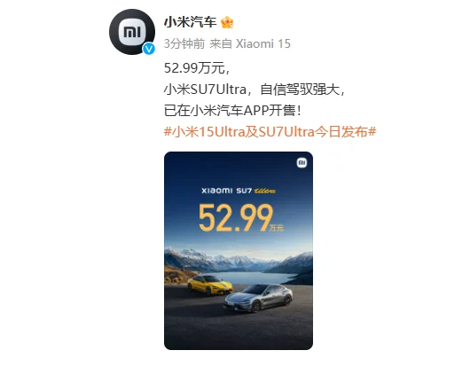 小米舉行Xiaomi 15 Ultra暨Xiaomi SU7 Ultra新品發佈會,小米15Ultra手機亮相,售價6499元起。同時發佈SU7 Ultra,定價52.99萬元,較小米去年透露的81.49萬元預售價大幅降低。