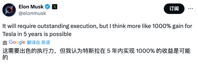 馬斯克在X上表示,這需要出色的執行力,但我認爲特斯拉在5年內實現1000%的利潤增長是可能的。前一天,他還在回覆看衰特斯拉的帖子下回復,稱“特斯拉長期的回報非常高。”