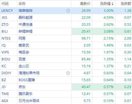 瑞幸咖啡漲5%,晶科能源漲超4%,嗶哩嗶哩漲超3%,中通快遞漲超2%,百度、金山雲漲超1%。