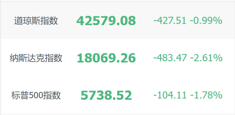 美股三大指數集體收跌,道指跌0.99%,納指跌2.61%陷入技術性回調區間,標普500指數跌1.78%,大型科技股普跌,博通跌超6%,特斯拉、英偉達跌超5%,Meta跌超4%,亞馬遜跌超3%。