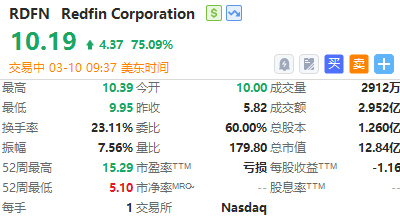 華盛資訊3月10日消息,美國房地產領域兩大巨頭聯手,Rocket豪擲17.5億美元鯨吞Redfin,截至發稿,在收購相關的利好消息刺激之下,房地產經紀商Redfin $RDFN 股價大漲超75%。