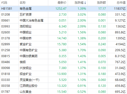華盛資訊3月11日消息,港股早盤,港股有色金屬股普遍上漲,其中,五礦資源漲超3%,洛陽鉬業漲超2%,中國鋁業、中國宏橋、招金礦業、紫金礦業、俄鋁、江西銅業均上漲。