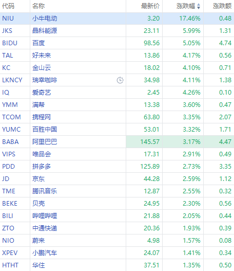 小牛電動漲超17%,小牛電動Q4營收同比增71.1%,電動滑板車銷量同比增64.9%;晶科能源、百度漲超5%,好未來、金山雲漲超4%,阿里巴巴漲超3%,拼多多、京東、嗶哩嗶哩漲超2%,蔚來、小鵬汽車漲超1%。