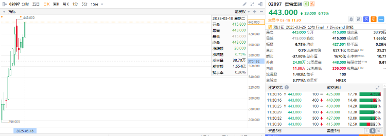 華盛資訊3月18日訊,次新股蜜雪集團大漲近7%,股價突破440港元逼近歷史新高。