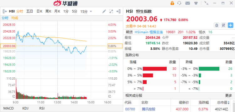 華盛資訊4月8日訊,經歷了“黑色星期一”後,今日早盤港股市場三大指數集體反彈,恒生指數一度漲約3%,恒生科技指數一度漲約6%;截至發稿,恒生指數漲幅收窄至0.88%,恒生科技指數現漲2.02%。