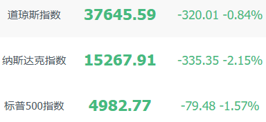 截至收盤,道瓊斯指數跌0.84%,標普500指數跌1.57%,納斯達克綜合指數跌2.15%。“七巨頭”集體走低,微軟跌0.92%,蘋果跌4.98%,英偉達跌1.37%,亞馬遜跌2.62%,谷歌C跌1.78%,Meta $META 跌1.12%,特斯拉跌4.9%。